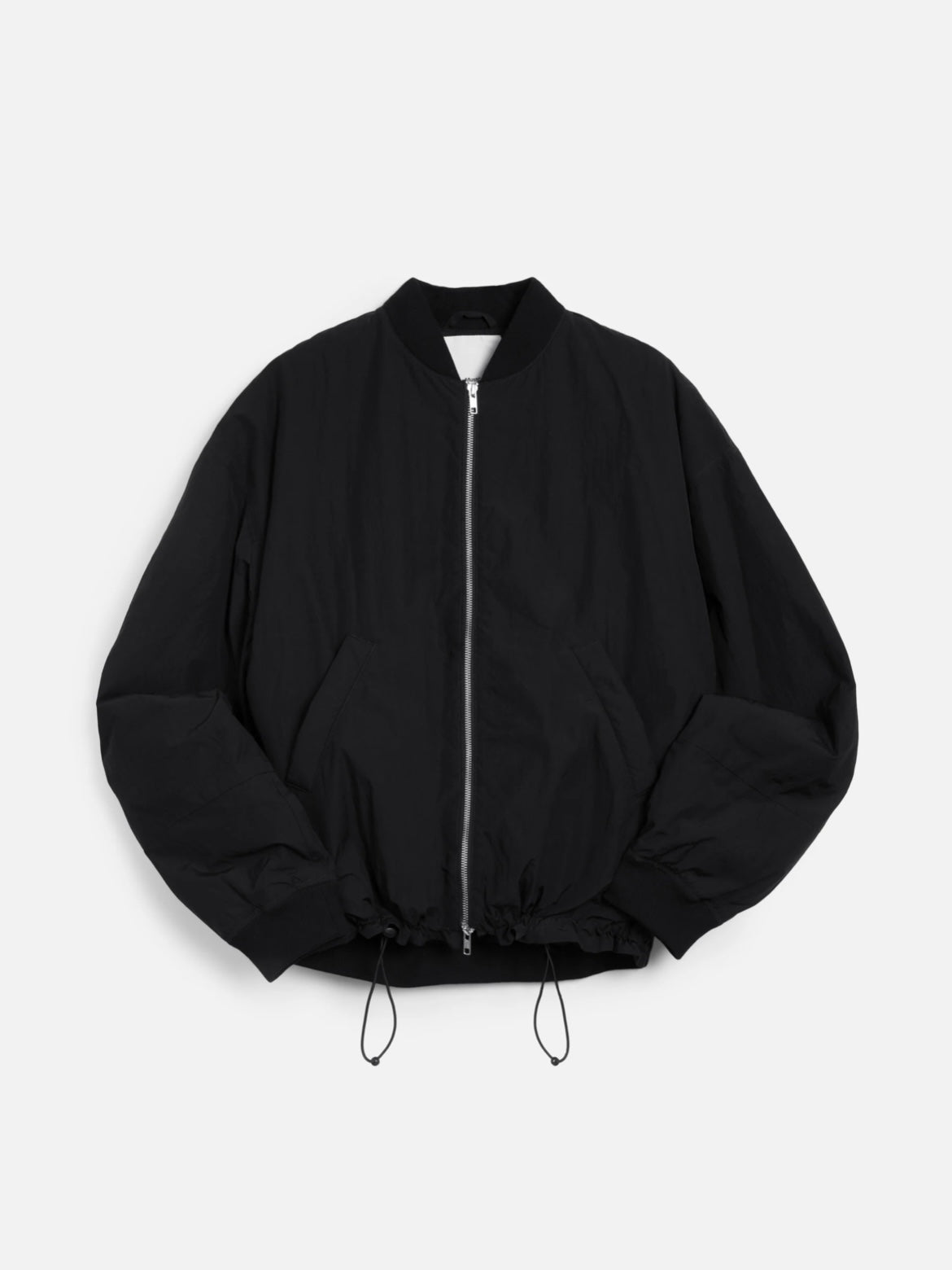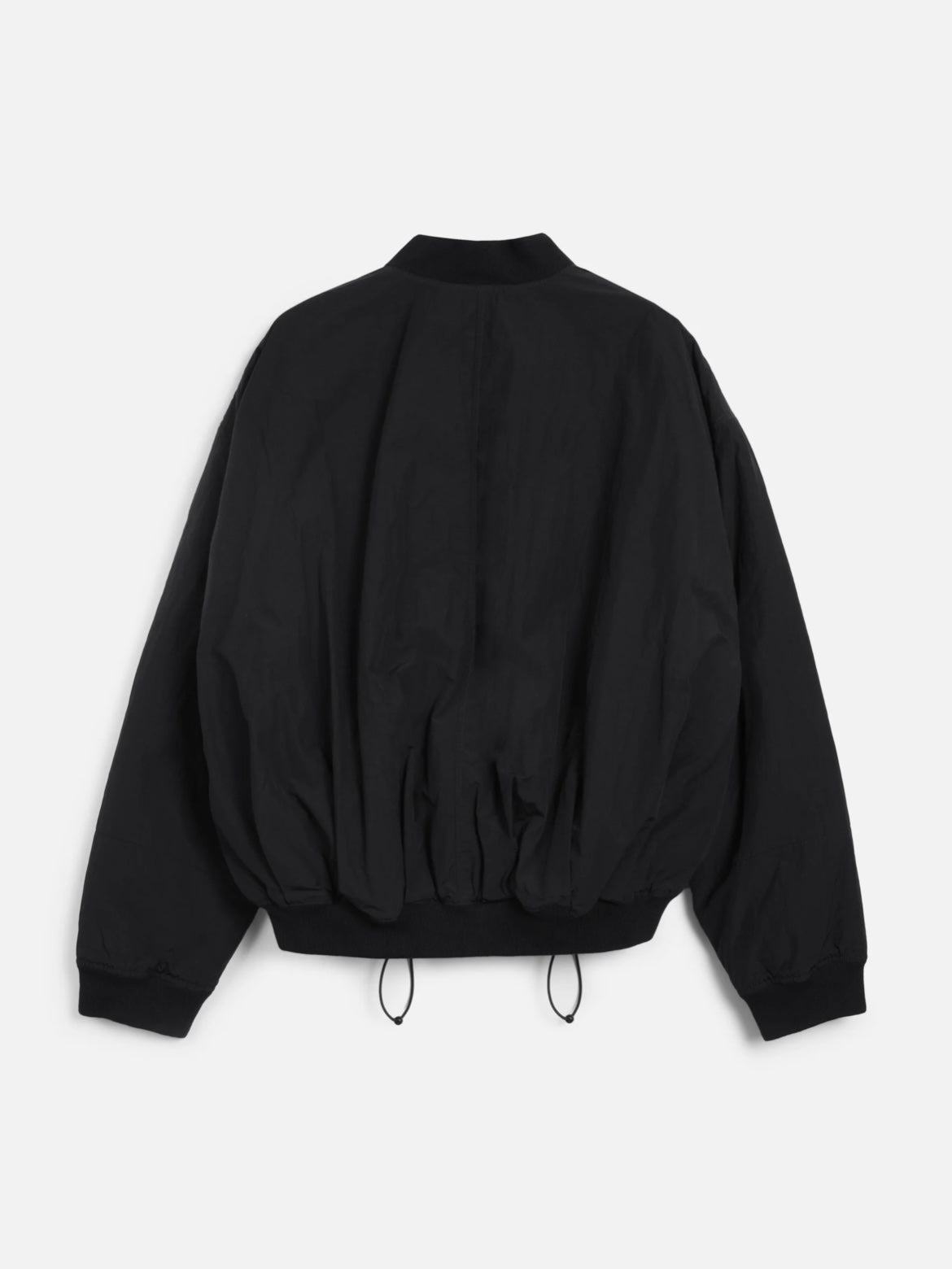 Relaxed unisex bomber jacket with wadded exterior made from recycled nylon and a cotton blend. Featuring welt pockets, adjustable drawcords on hem, and rib knit collar, cuffs, and back hem. Cotton lined with recycled poly wadding.