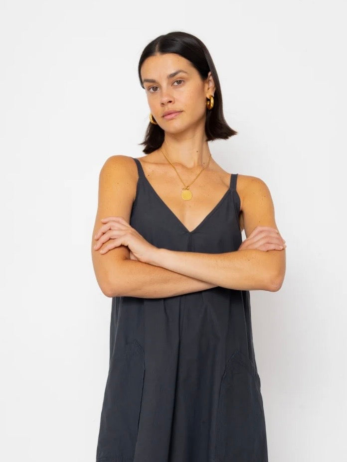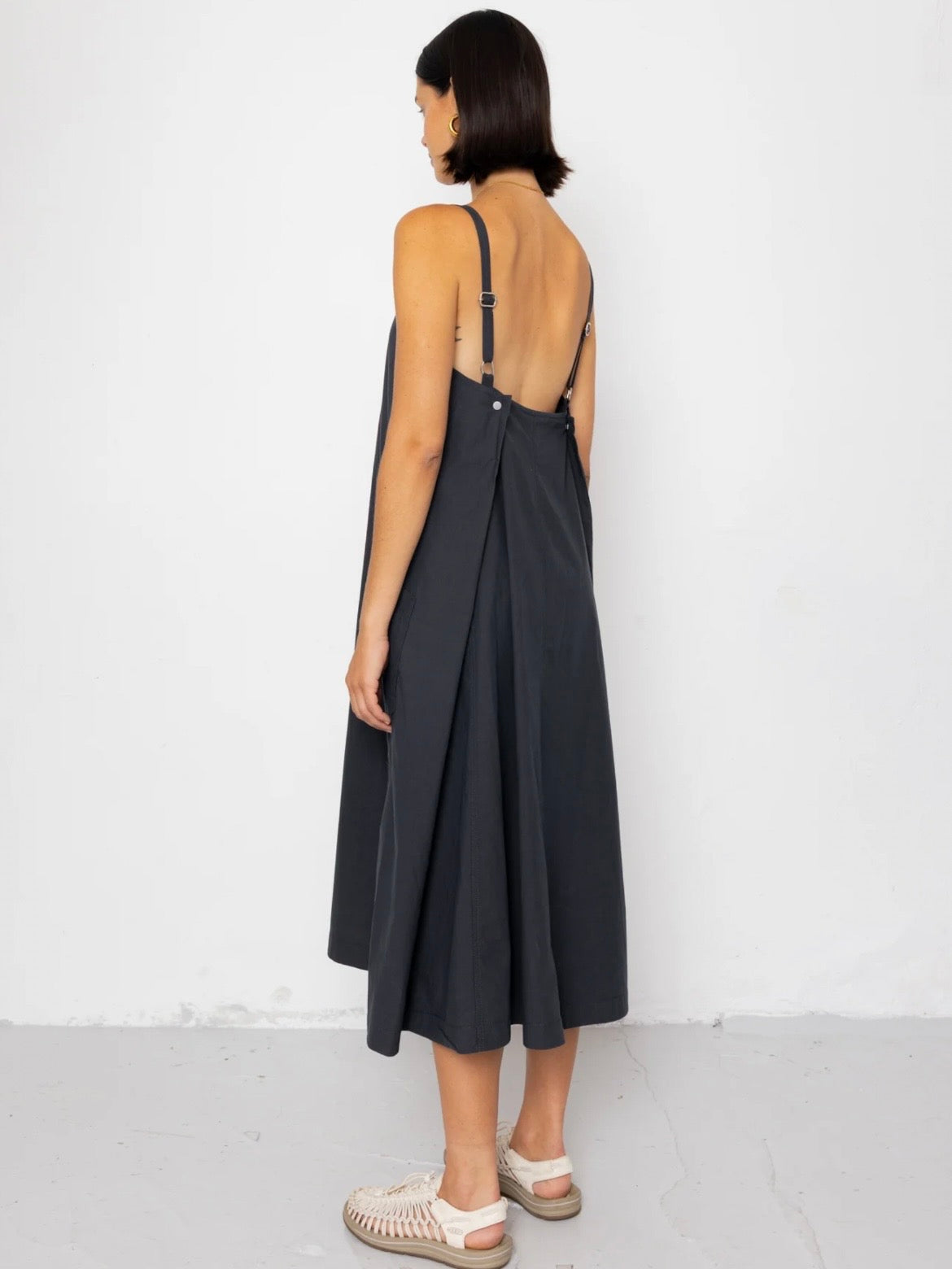 The Amy dress is a V-neck midi length dress wit thin adjustable straps and a metal buckle.