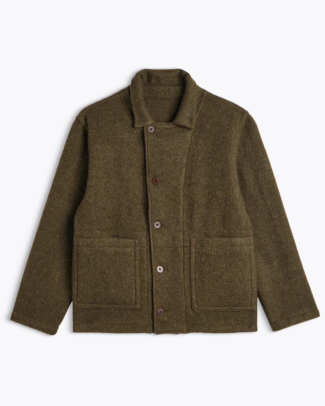 Designed with a clean, functional look in mind, this reversible straight-cut jacket plays with contrasts between the inside and outside. A decorative herringbone band placed at the inner waist adds a subtle touch of refinement. Equipped with large patch pockets on both sides, it blends utilitarian style with a commitment to sustainability through the use of upcycled fabrics.