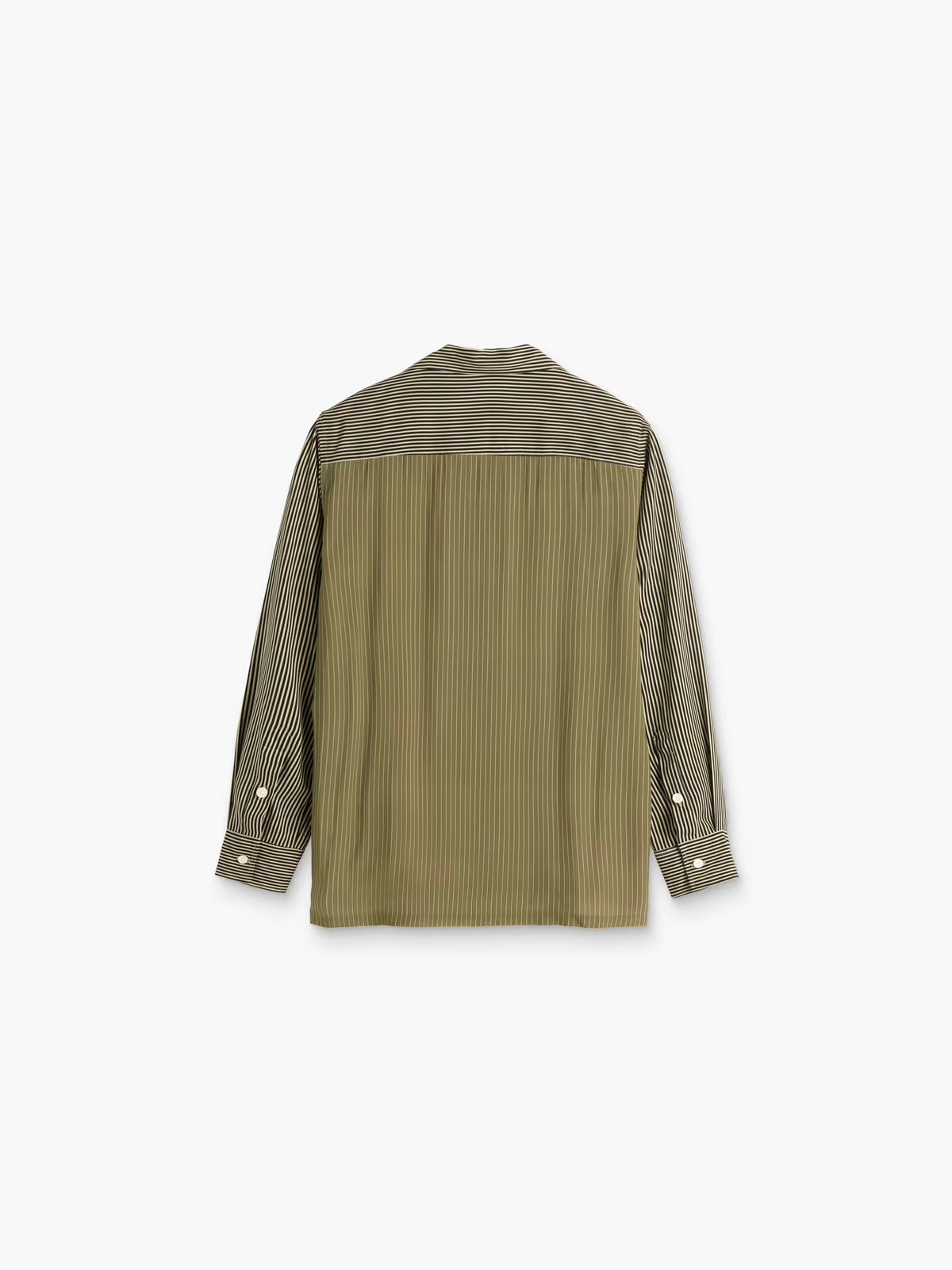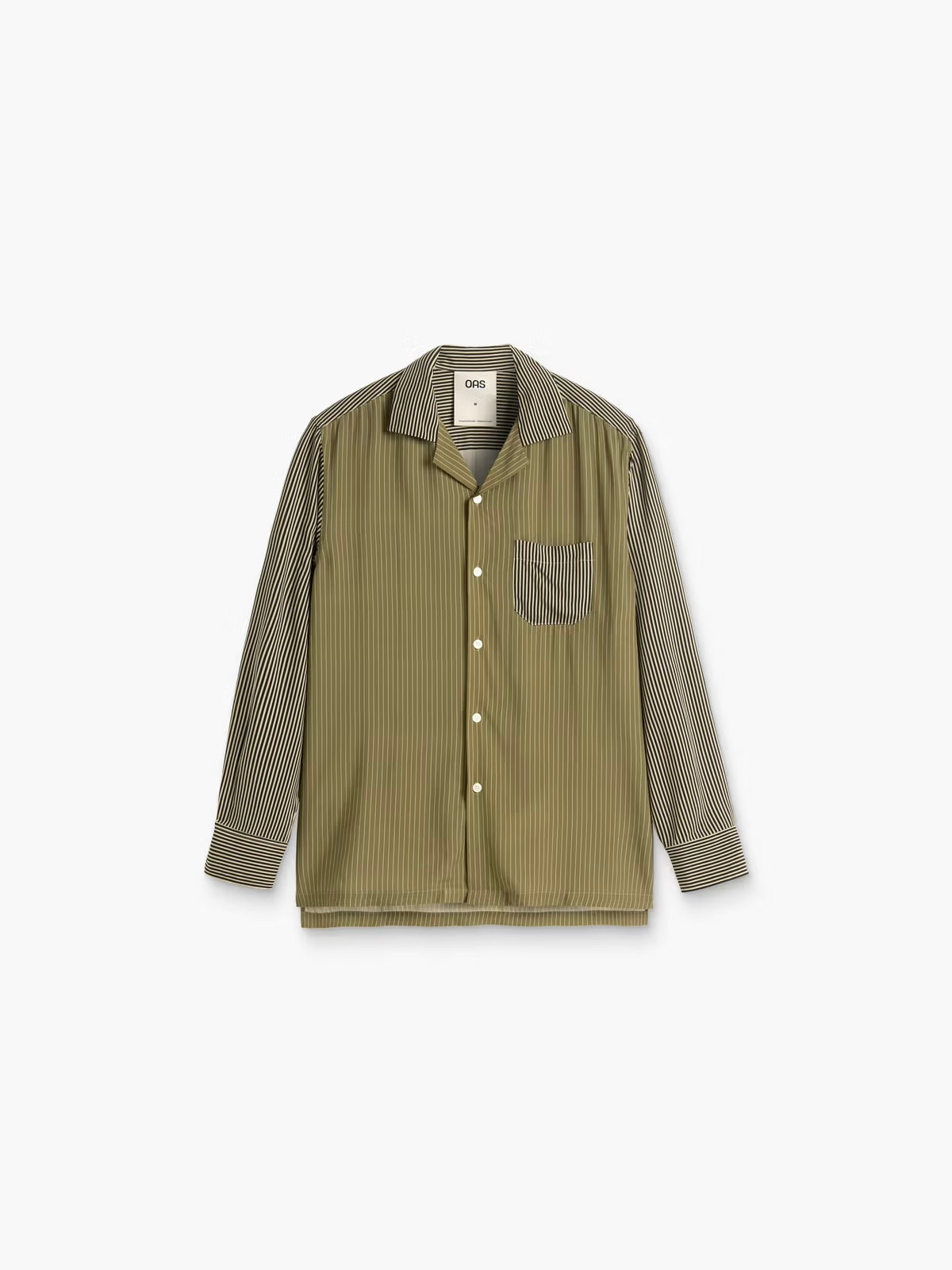 Stunning striped shirt cut from a lightweight viscose fabric in contrasting tones. A soft texture with a silky breathable feel. Featuring a resort collar and single chest pocket. A relaxed fit with a slightly dropped shoulder.