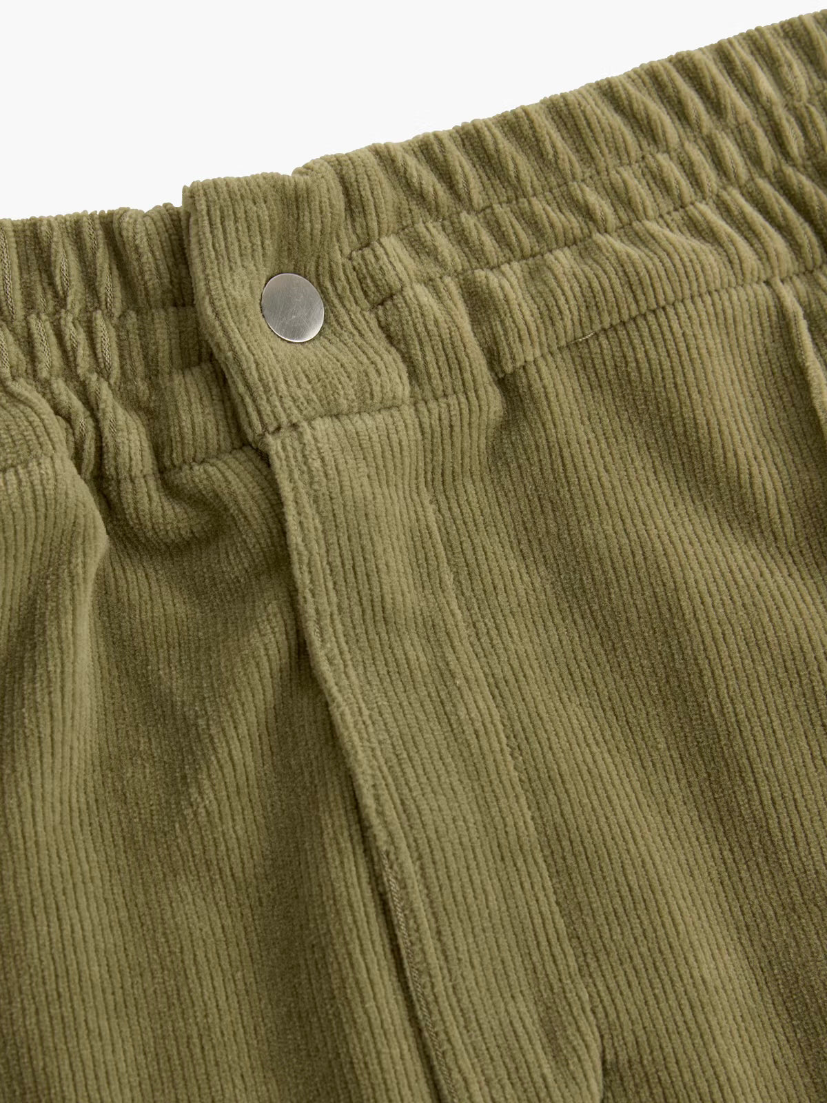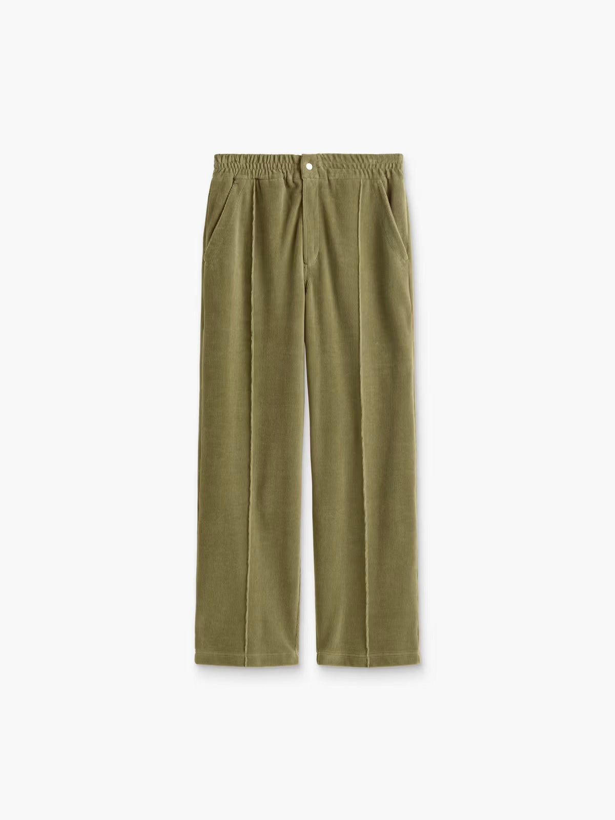 Relaxed trouser cut from knitted cord velour. A soft texture with a subtle ribbed surface. Featuring an elastic waistband, zip fly and a snap button fastening. With stitched pleats front and back, slanted side pockets and two back pockets, this straight cut pant is suitable for many occasions, whether dressed up or down.