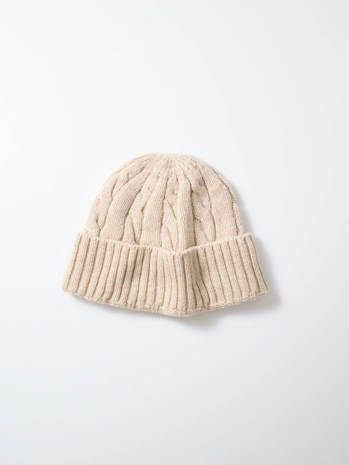 A lightweight watch cap made with washable (shrink-resistant) merino wool yarn, knitted in a classic cable pattern. Designed in a shorter length for a clean silhouette, it’s easy to wear across a wide range of seasons.