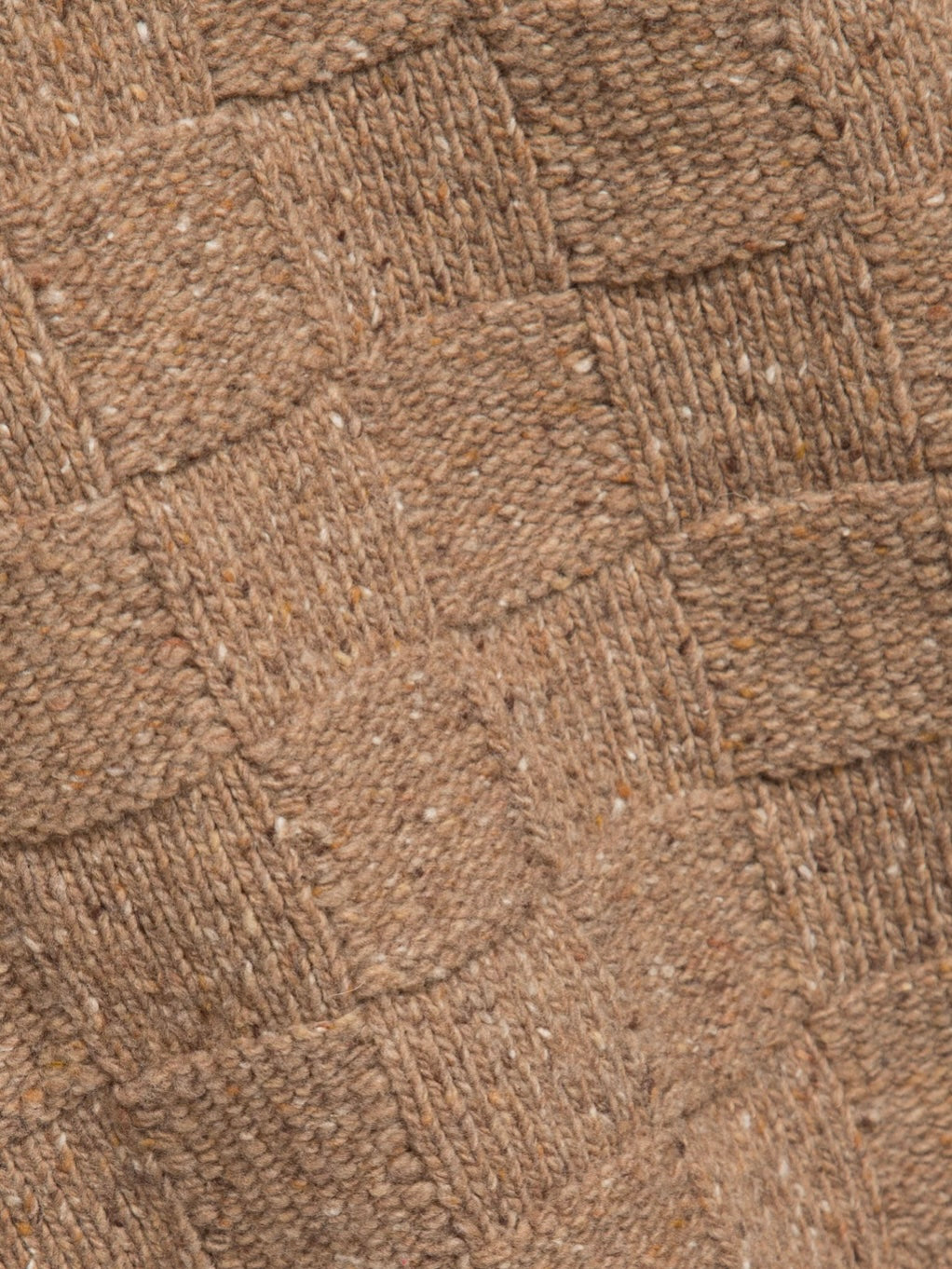 Simple Merino wool blend cardigan with Donegal yarn, collared design, checked pattern, Corozo button closure, and rib knit cuffs and hem. Regular fit.