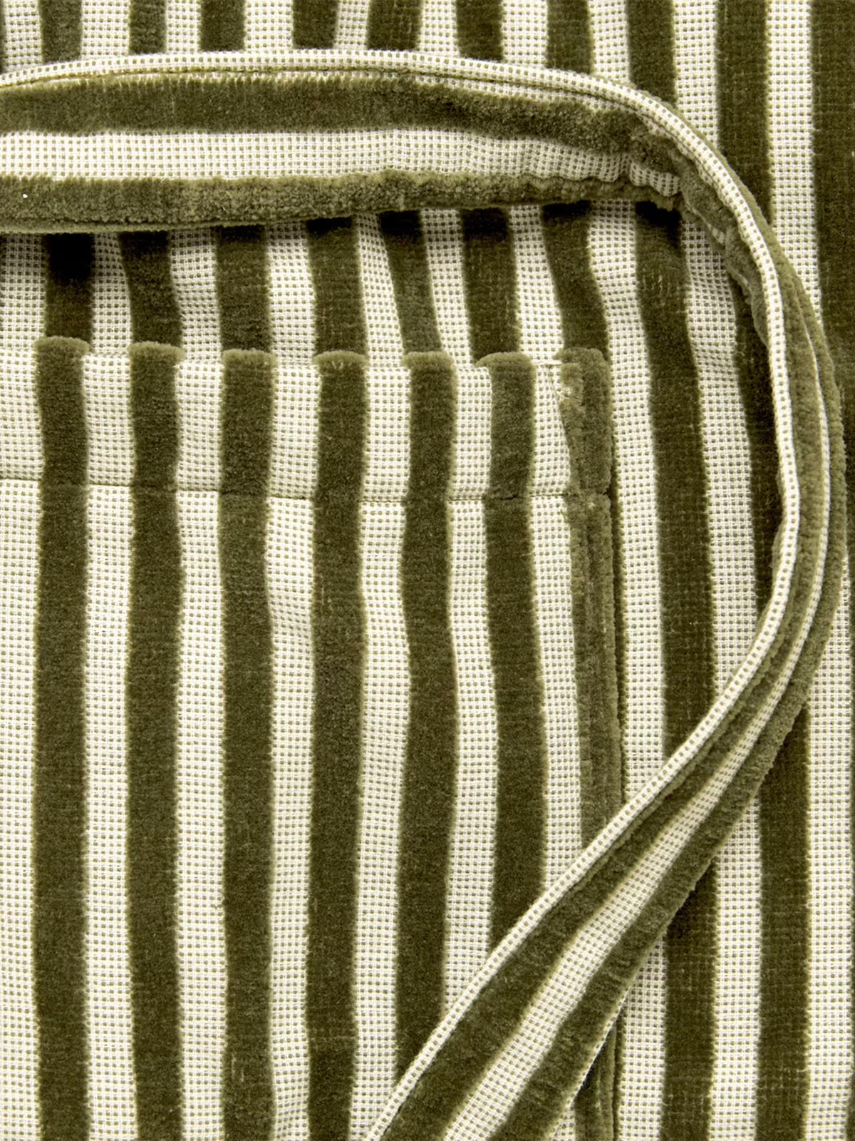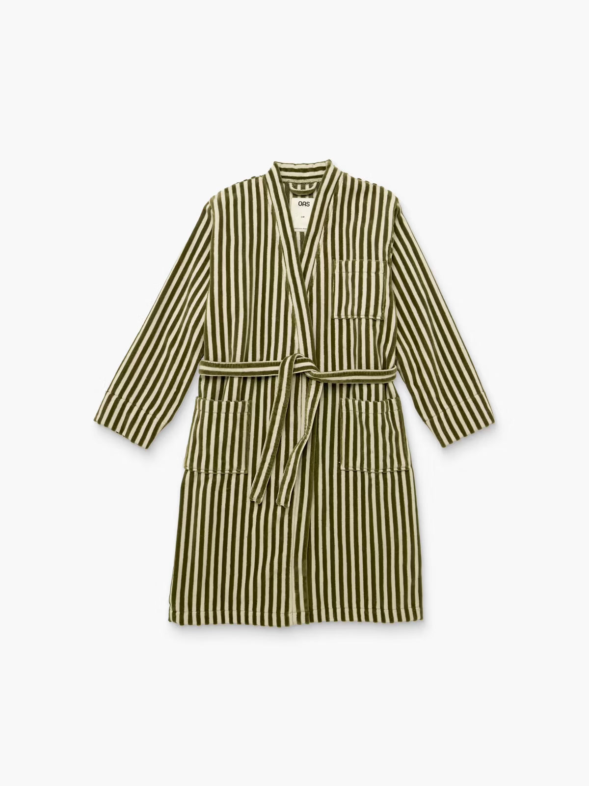 Astounding robe but from a heavyweight jacquard woven Terry velour. Knee length with a breathable texture. Featuring two large front pockets, one chest pocket and a self-fabric waist belt. A roomy unisex fit.