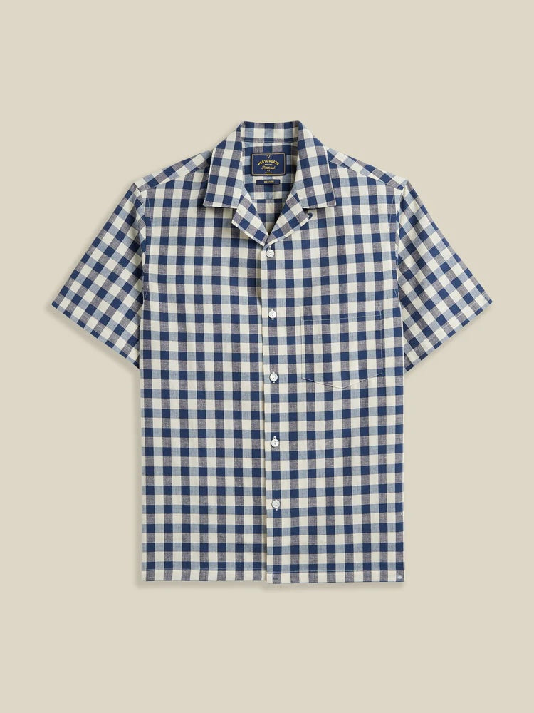 Classic camp collar shirt with full button front and MOP buttons.