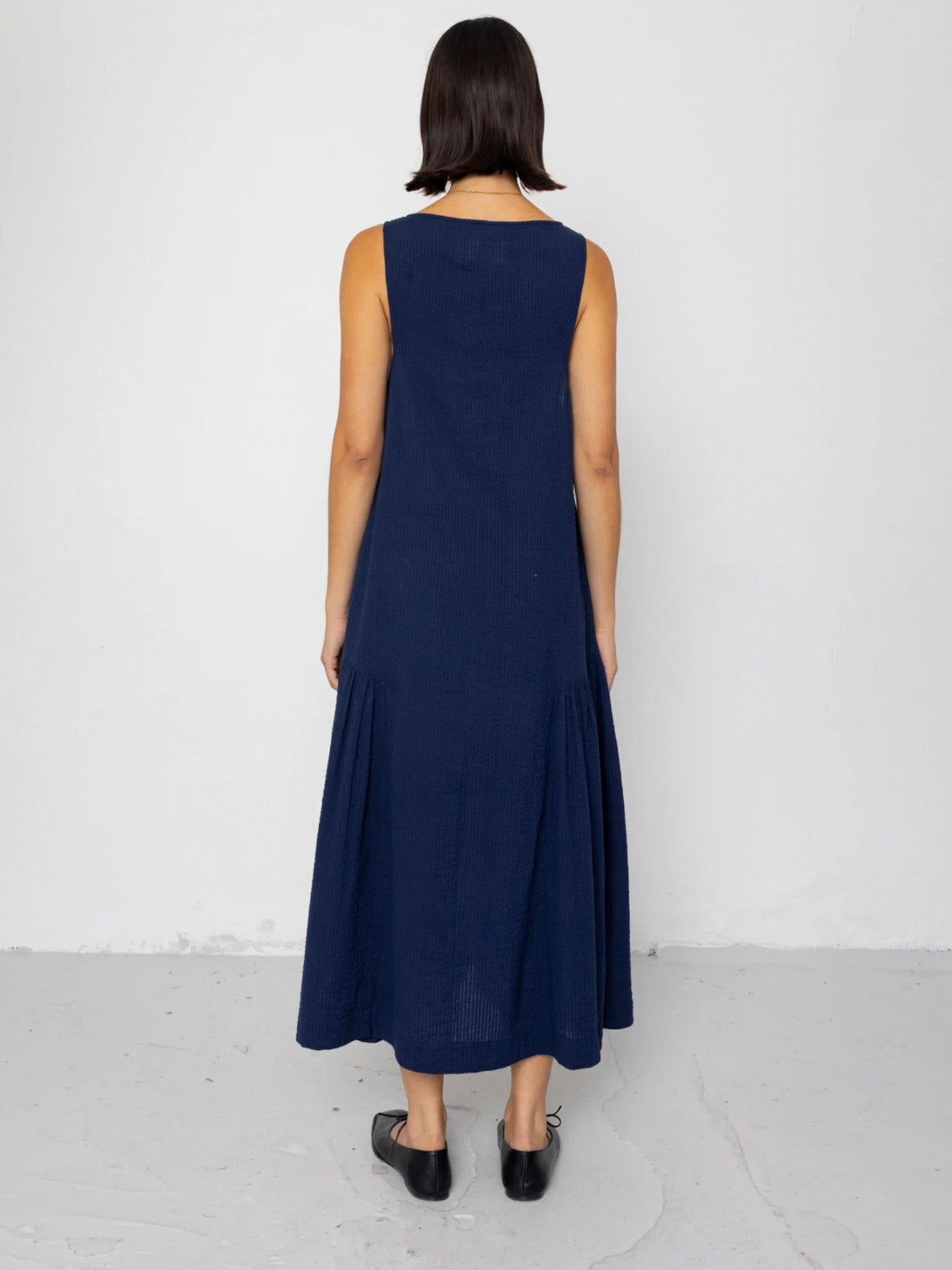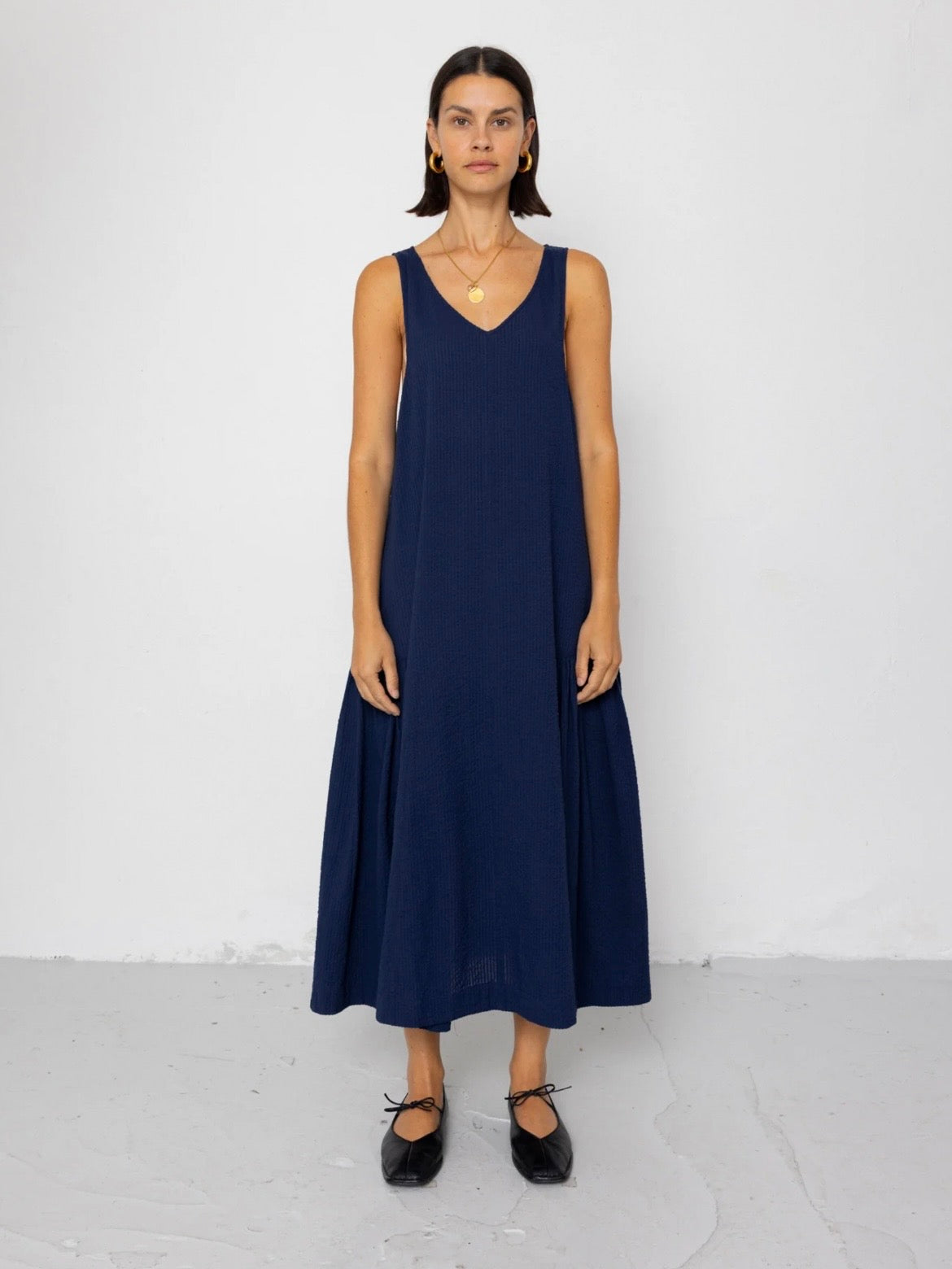 The Sarah dress is a sleeveless maxi dress, designed in a local Indian seersucker which is garment dyed for depth of colour.