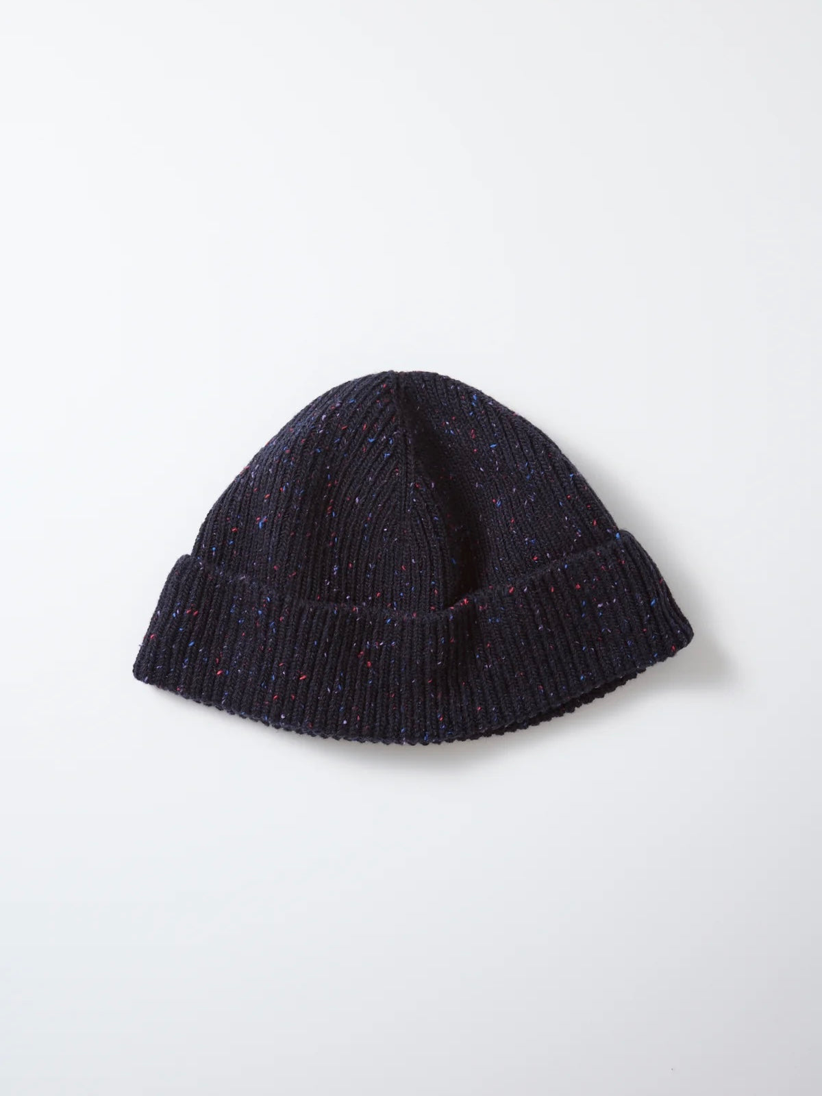 A beanie made with colorful nep yarns. Crafted using sock knitting techniques with stretch yarns, it offers a snug yet comfortable fit and maintains its shape over time. Knitted on a WHOLEGARMENT® machine, it eliminates the need for sewing and cutting, ensuring a smooth, seamless feel against the skin.