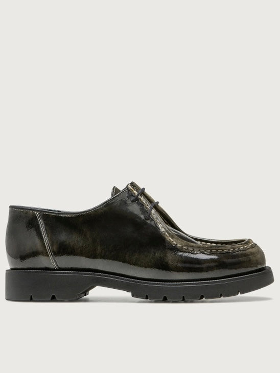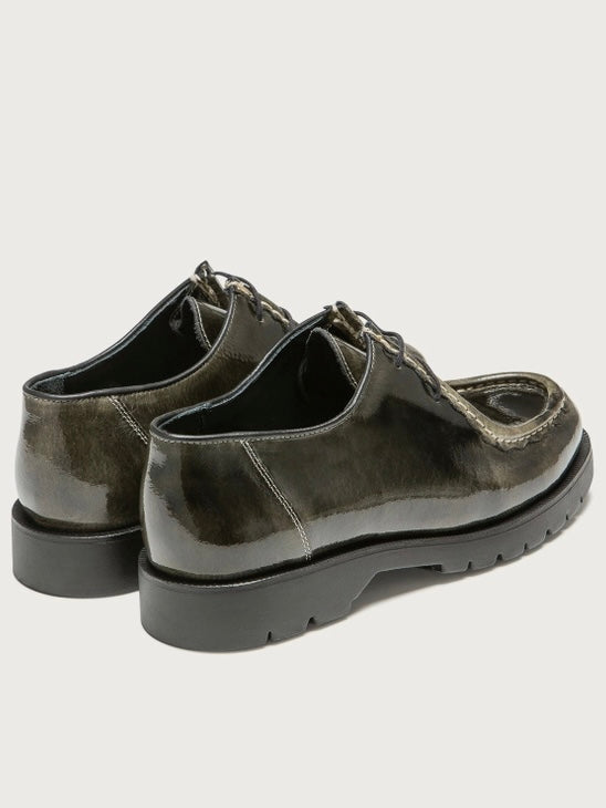 Lace-up shoes cut from glazed suede leather giving a beautiful mottled sheen.