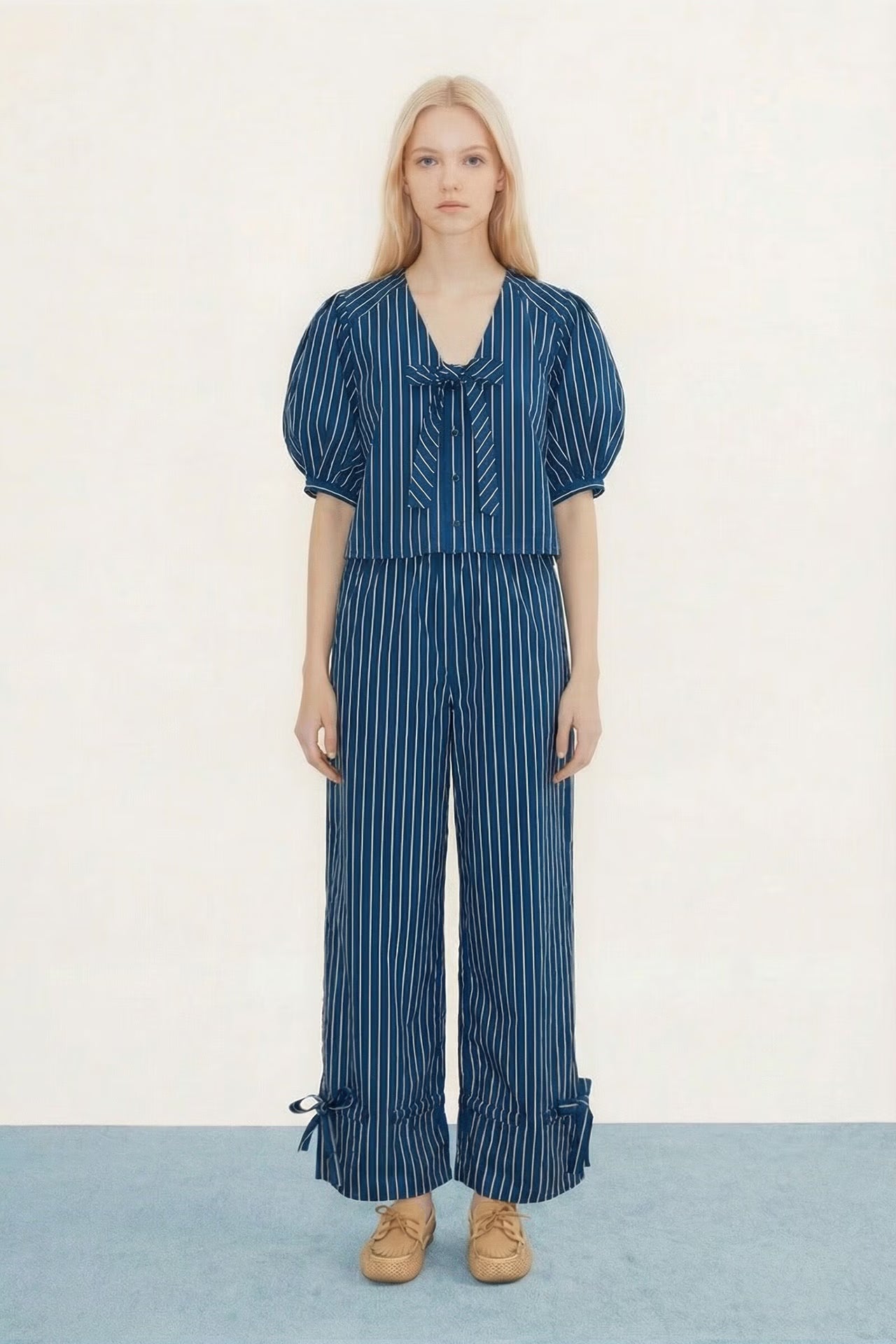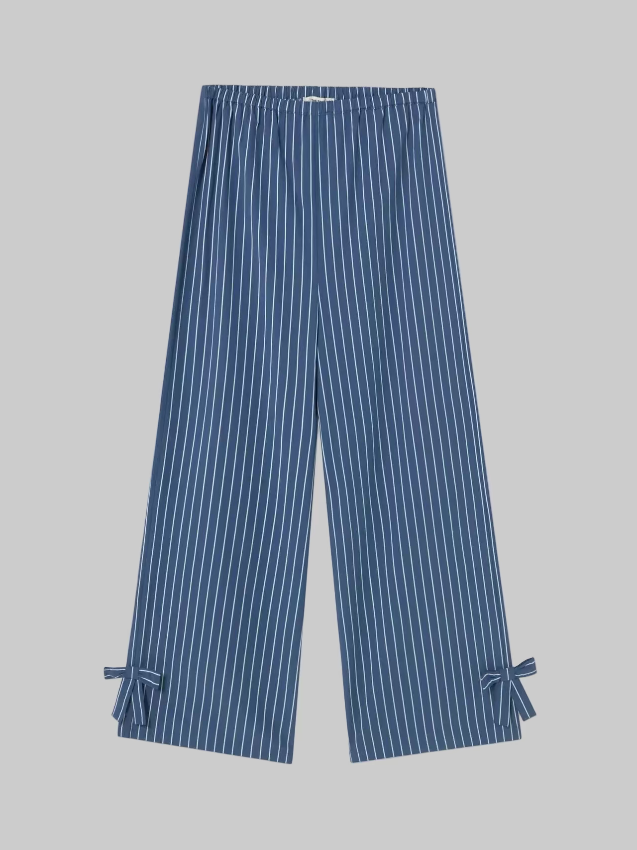 Pants in pure lightweight cotton with a dry, crisp touch and subtle crinkle effect. Cut on a light navy base with a striped print, they feature an elasticated waistband, a relaxed leg silhouette, and fixed side bow details. Available with a matching top for a coordinated look.