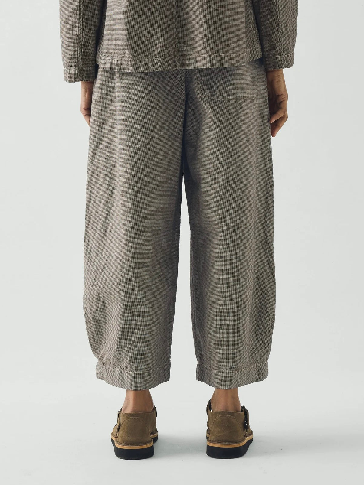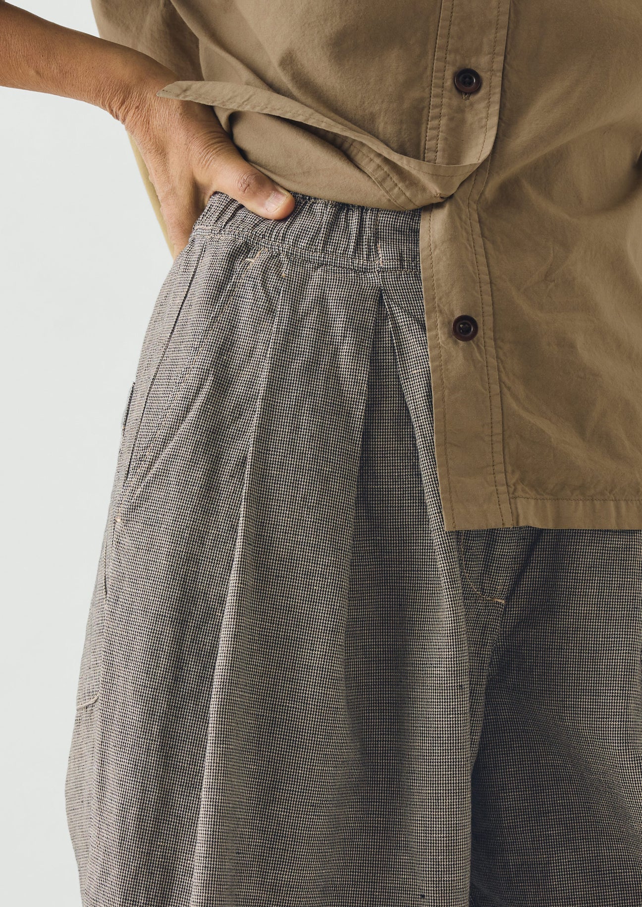 Cotton and linen-blend micro houndstooth. Garment-dyed. Easy shape. Elasticated waist. Front inverted box pleats. Back patch pocket. Ankle-skimming wide legs. Zip and corozo button.