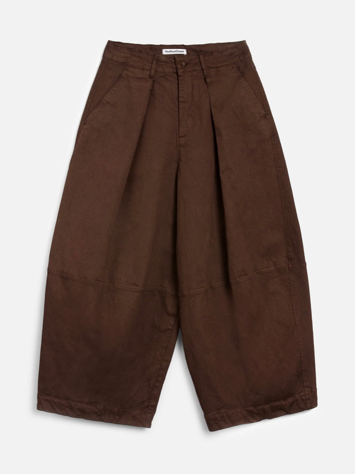Simple, full-length deadbeat trousers made from a blend of modal and cotton. Features centre front pleats, two side pockets and a back patch pocket. Corozo button waistband fastening and YKK zip fly for easy wear. Oversized, relaxed arc-shaped silhouette with a split-leg panel and deep hem.