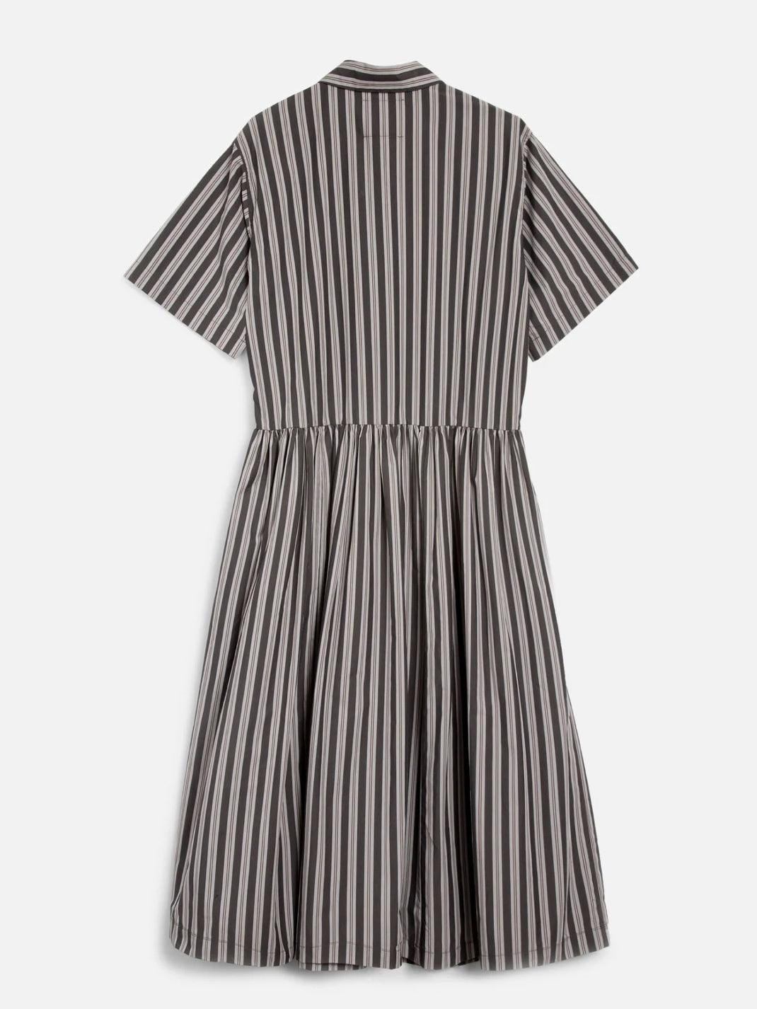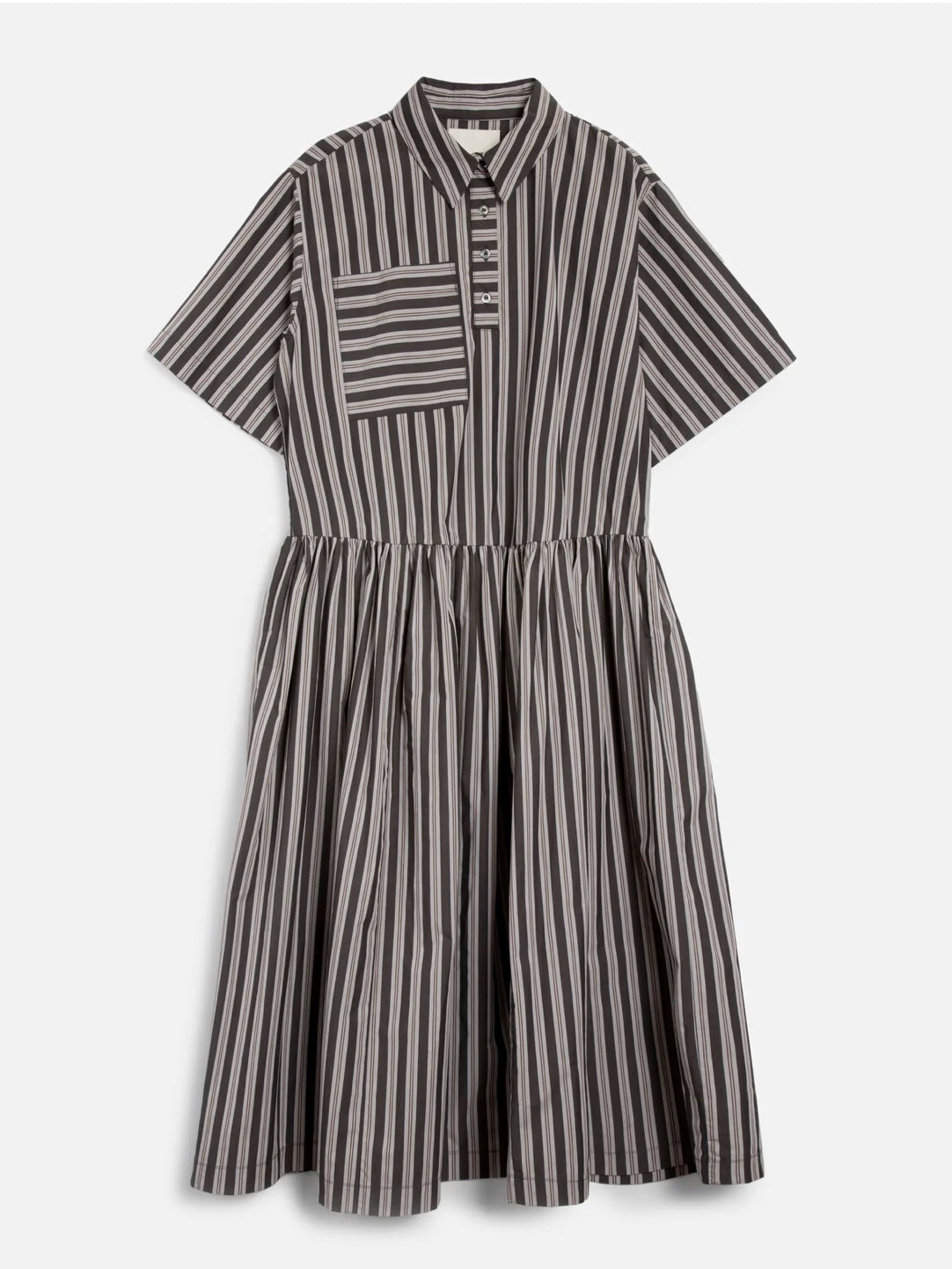 This YMC Women Parklife Dress features a short sleeve midi design made from Portuguese stripe cotton. It has a regular collar and a chest patch pocket, as well as slit pockets in the side seams for added convenience. The dress is fastened with Mother of Pearl buttons and includes a dropped waist detail for a touch of style. Its oversized fit makes it a comfortable and versatile piece.