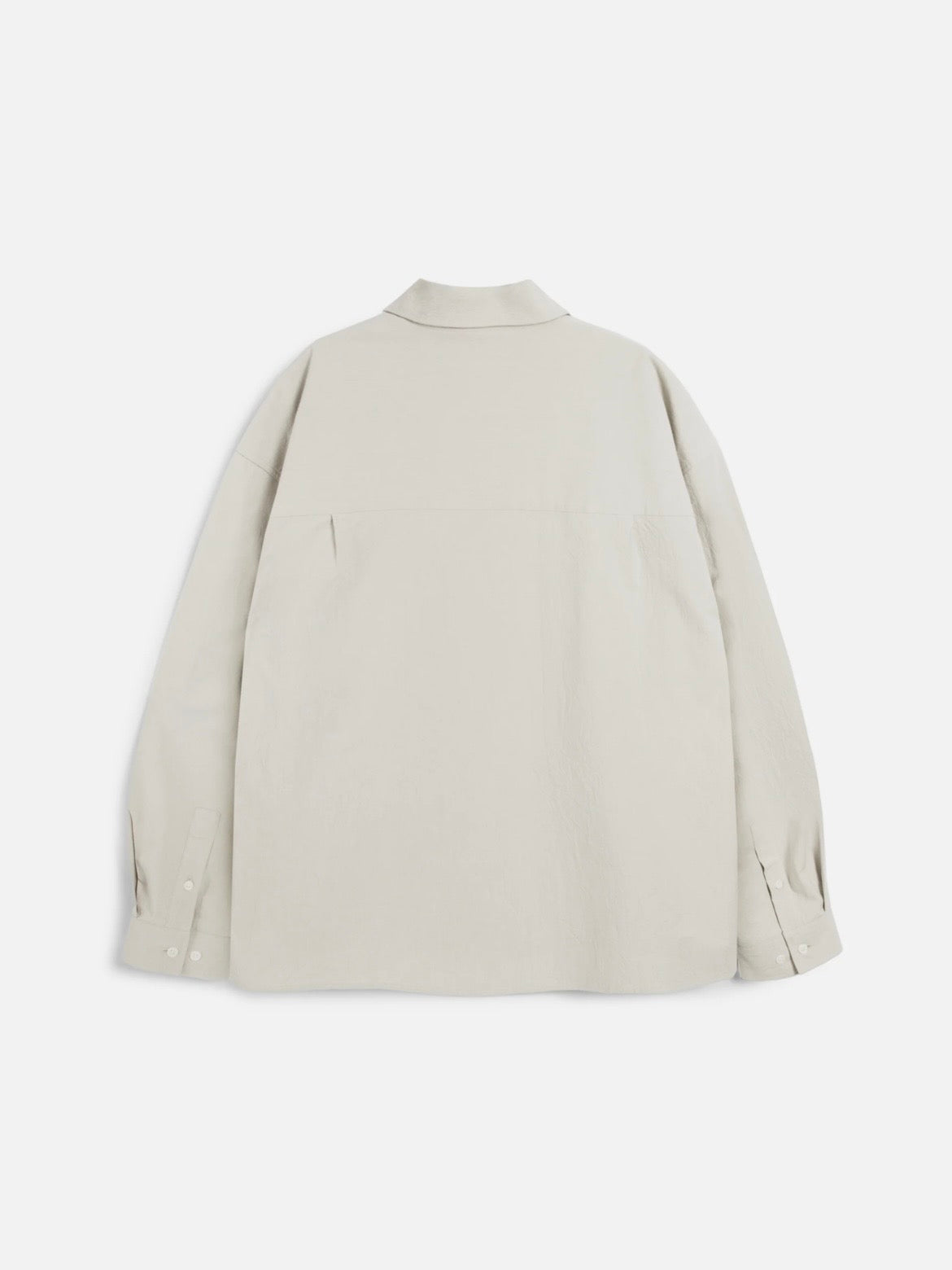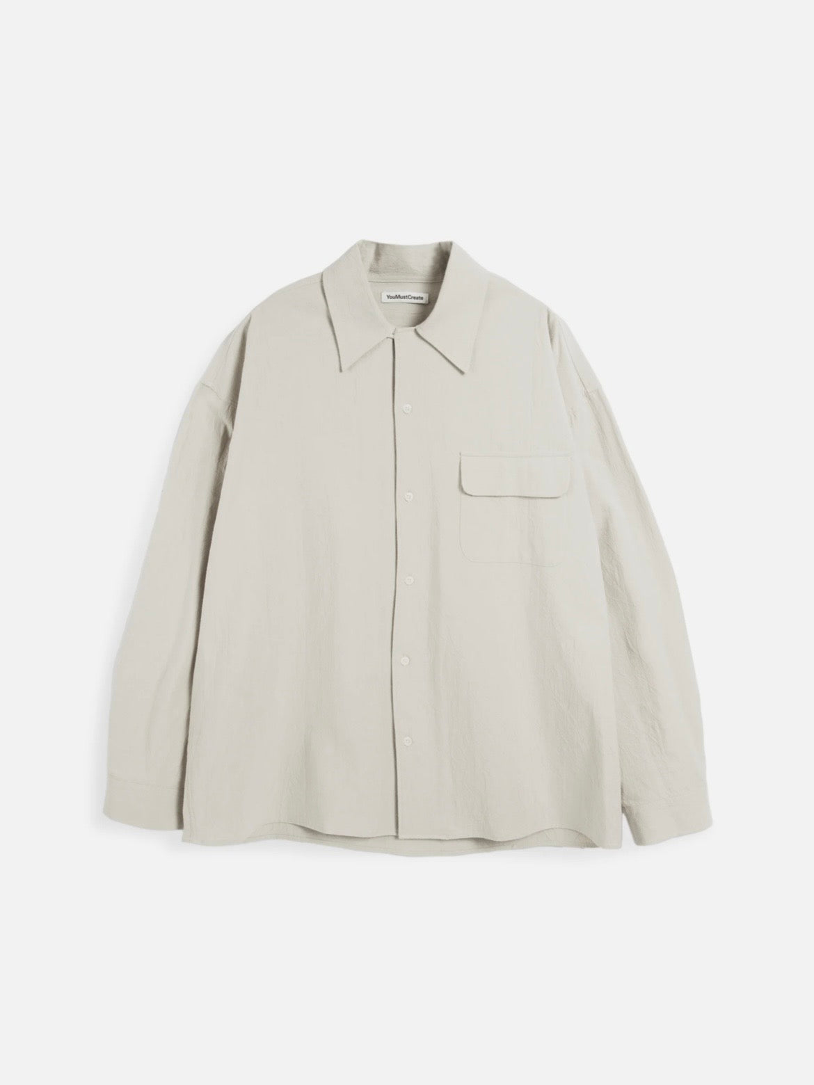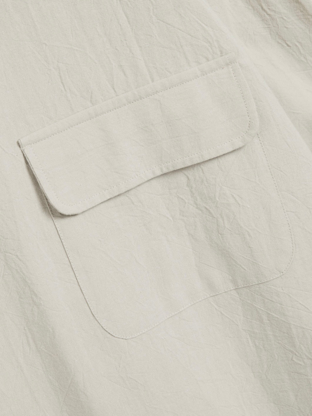 Crafted from premium Japanese cotton, this relaxed-fit shirt showcases a distinctive textured crinkle weave that adds visual depth and tactile interest. The Cuban-style collar and chest patch pocket with flap deliver classic menswear appeal, while corozo button closures provide sustainable durability. Designed with an unisex cut for versatile styling.