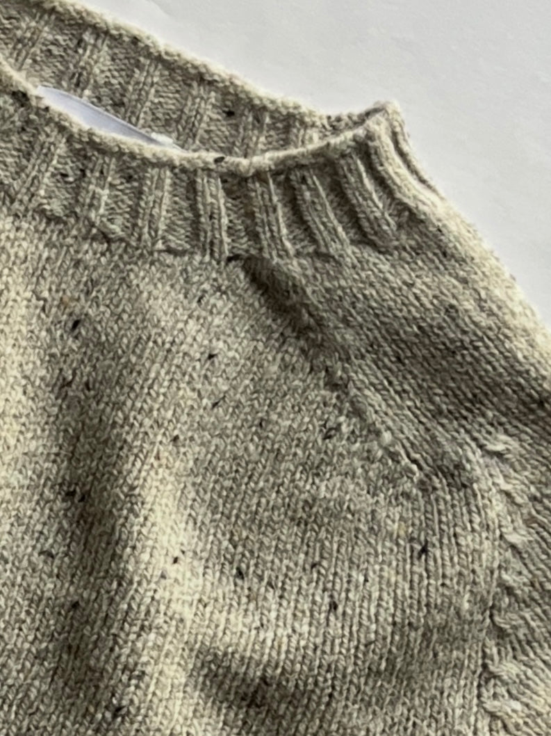 A cropped classic crew neck jumper knitted in a beautiful neps yarn. Featuring ribbed cuffs and hem.