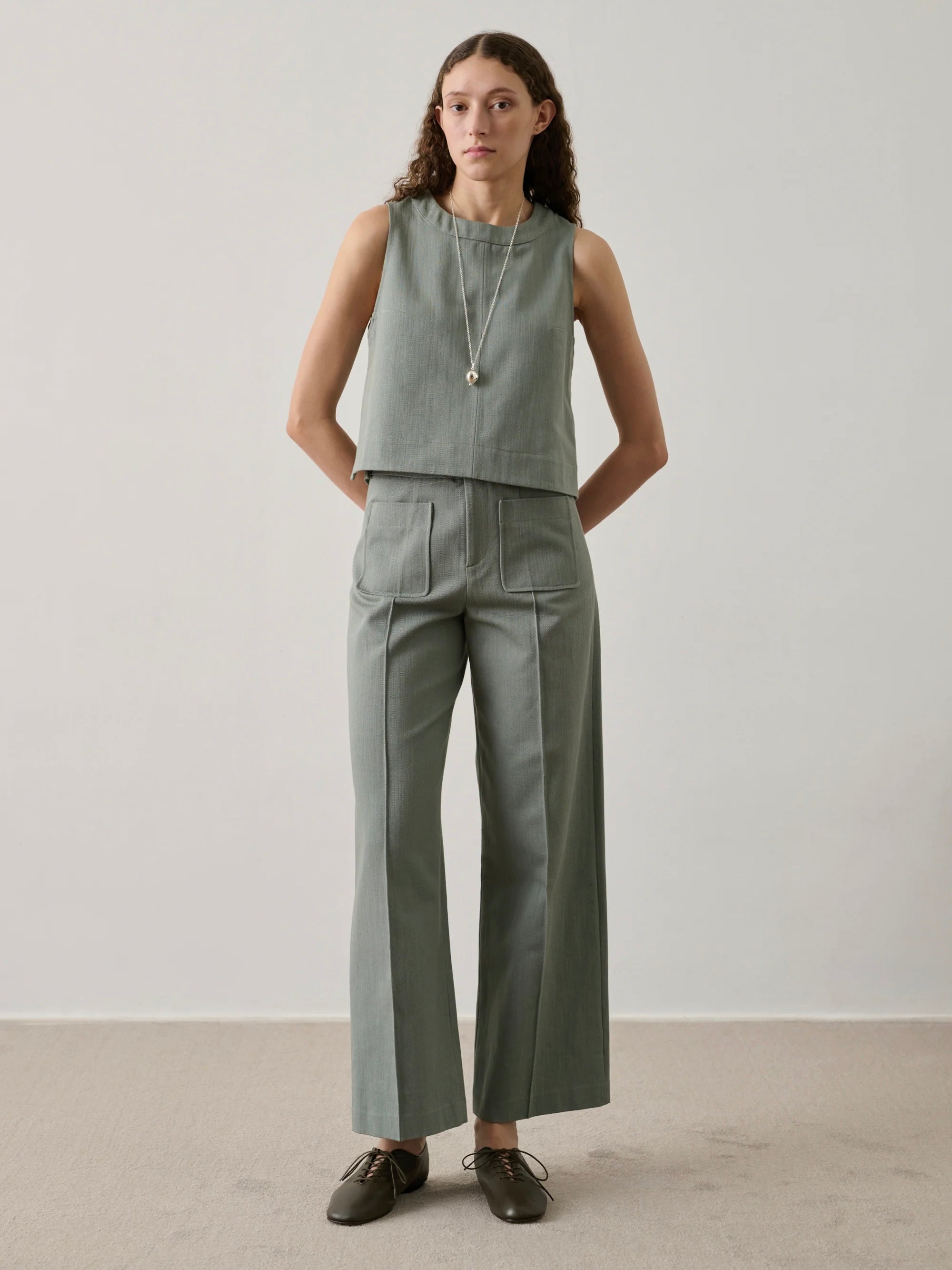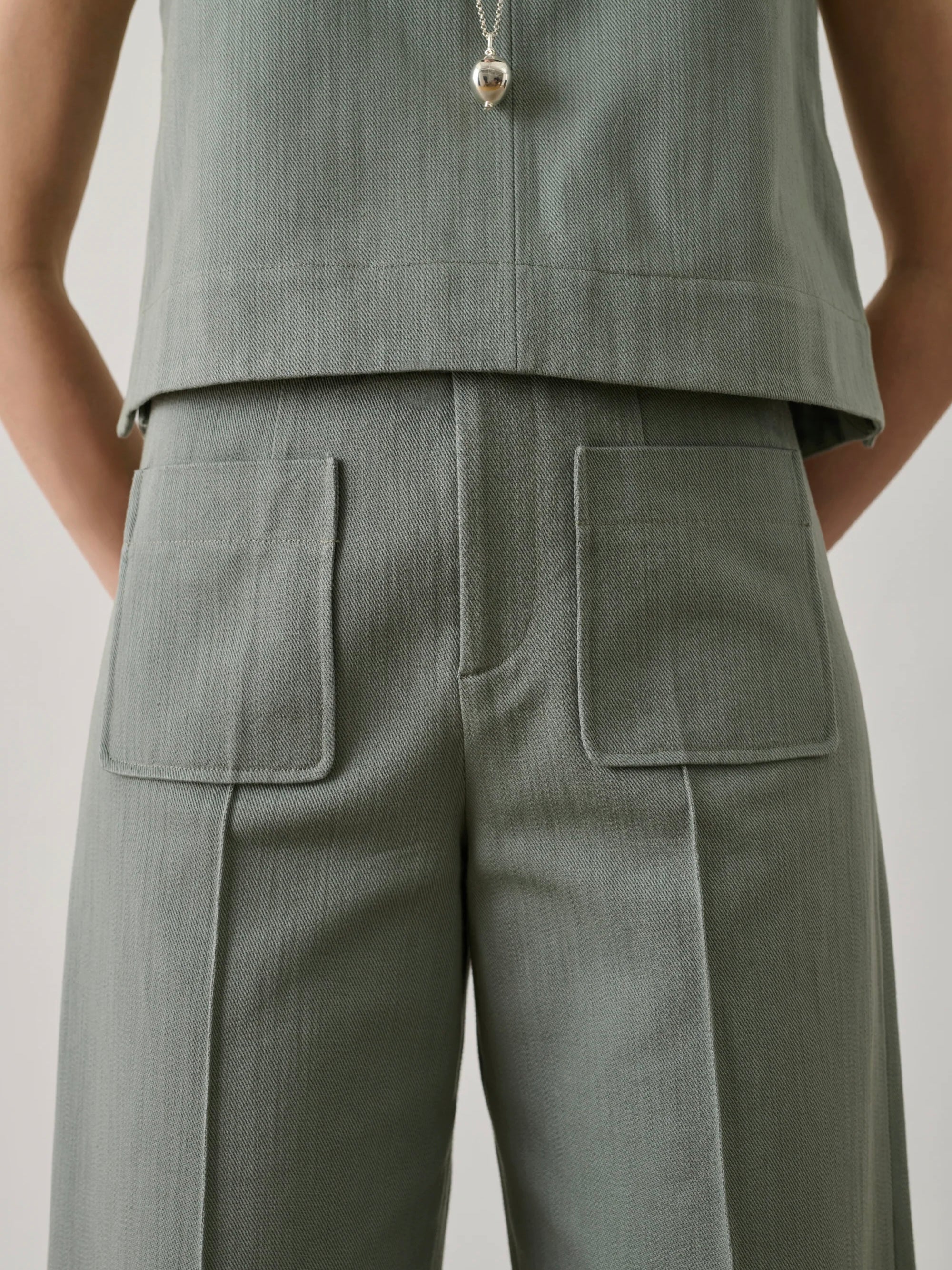 - Zip and press-stud fastening - Two patch pockets on the front and back - Pressed crease along the leg - Cotton canvas
