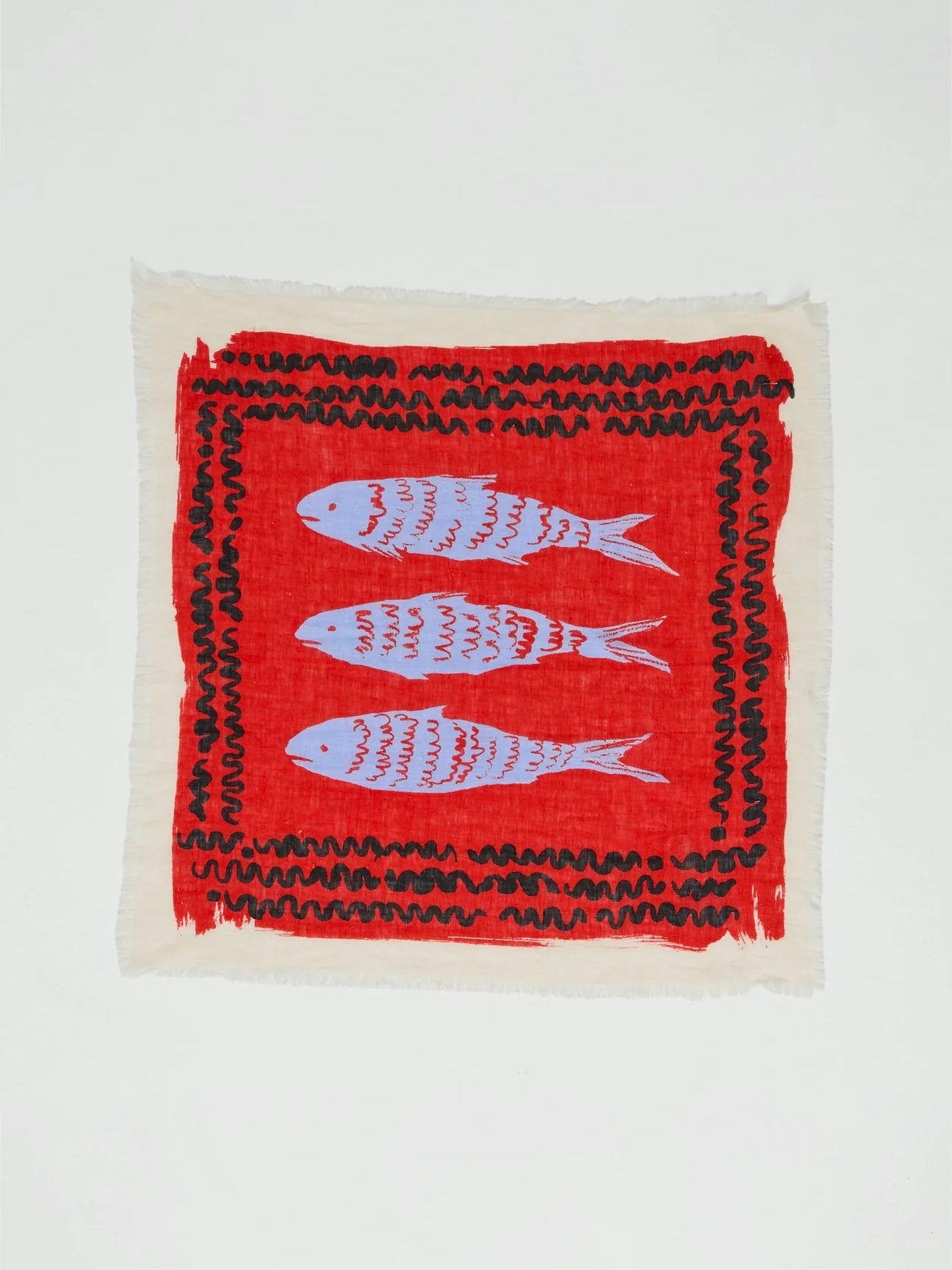 Cheerful linen bandana hand screen-printed in India with a market fish pattern print inspired by a slipware plate by UK maker Rachael Cocker. Framed with a wavy border and finished with tactile frayed edges.